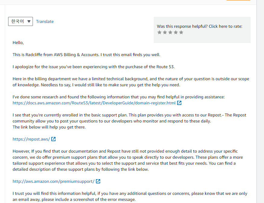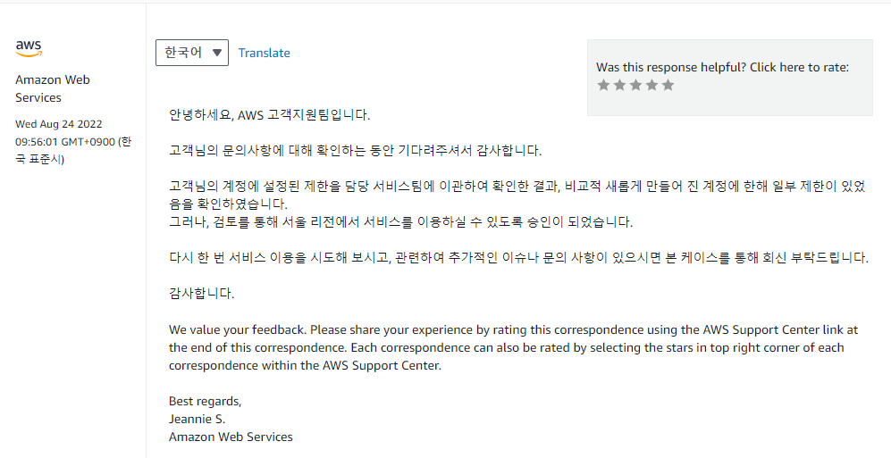 아래에도 적겠지만, 이를 해결하고 싶으면 저 이메일 주소가 아니라 AWS 홈페이지 내의 문의 센터를 이용하는게 가장 빠르게 답변을 받아 볼 수 있었다.