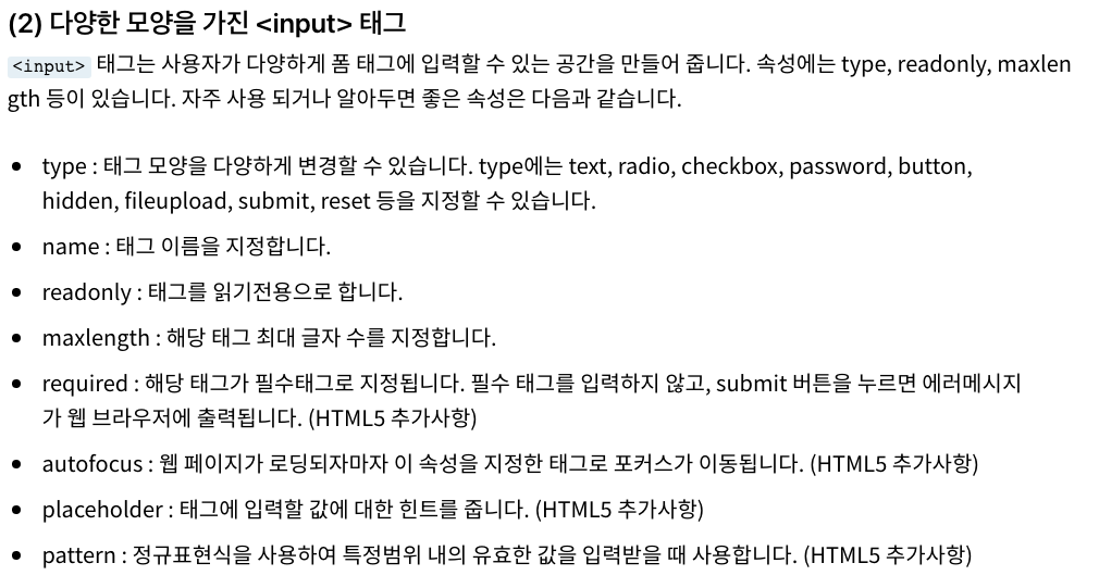또한 이 form 태그 안에 어떠한 정보를 입력받을 칸으로는 input 태그를 주로 사용하는데요, 이 input 태그에 주로 사용되는 속성은 다음과 같습니다.