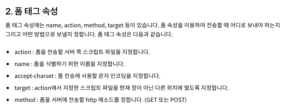어떠한 정보를 입력받고, 이를 웹 서버로 전송하기 위해서 HTML에선 주로 form 태그를 쓰는데요, 이 form 태그에 주로 사용되는 속성들은 아래와 같습니다.