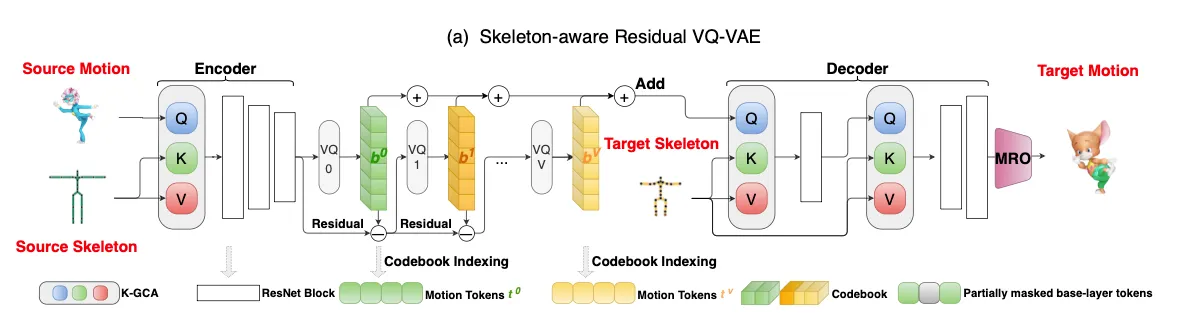 이 모델에선 인코더는 모션 시퀀스와 스켈레톤을 입력받아 스켈레톤에 상관없는 (skeleton-invariant) latent feature를 추출할 수 있도록 학습됩니다. 출력은 MoMask 등에서 사용된 Residual Quantization 과정을 거쳐서 이산적인 코드 시퀀스로 변형됩니다. 디코더는 이 코드 시퀀스와 함께 타겟 스켈레톤을 입력받아 motion latent feature가 타겟 스켈레톤에 맞춰진 모션을 생성할 수 있도록 학습됩니다.