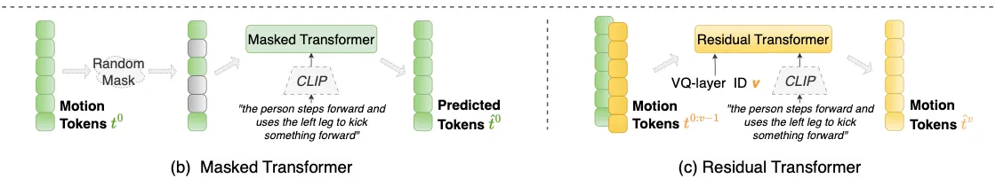 - Masked Transformer(Base Layer) : 기저 레이어 토큰을 생성하는 역할을 수행하면서 모션의 전역적인 일관성, 즉 큰 흐름을 먼저 만듭니다.