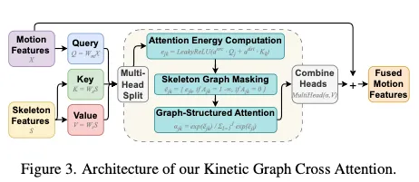 Q(모션)는 K(스켈레톤)와 상호작용하여 현재 움직임이 골격의 어떤 구조적 특징과 밀접하게 연관되어 있는지(Attention Score)를 계산하고, 이 점수를 바탕으로 V(실제 골격 정보)를 가중합하여 원래의 모션 특징에 더해줍니다. 즉, 단순히 움직임만 있는 정보에 '이 움직임은 이런 골격 구조 위에서 이루어진다'는 맥락을 주입하는 것입니다.