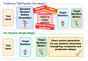 최근 Diffusion, LLM 기술의 발전에 힘입어 Text-to-Motion 분야도 빠르게 성장하고 있습니다. 하지만 기존 기술들은 대부분 표준화된 스켈레톤(Standard Skeleton) 상에서만 동작한다는 한계가 있었습니다. 만약 새로운 캐릭터 골격에 이 모션을 적용하려면 번거롭고 전문 지식이 필요한 리타게팅(Retargeting) 과정을 거쳐야만 했고 이는 초보자들에게 큰 진입 장벽이었습니다.