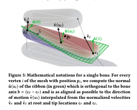 뼈를 기준으로 리본 형태의 분할 면을 먼저 정의합니다. 각 버텍스는 스키닝 가중치를 고려해서 해당 뼈대의 운동 방향에 따른 오프셋 값을 리본 형태의 분할 면에서 정의되는 리본 법선(n)을 기준으로 계산합니다. 다만 이때 뼈의 축과 운동 방향이 평행할 경우에 발생하는 전단 현상을 방지하기 위해서 Collinear Weight을 적용합니다.